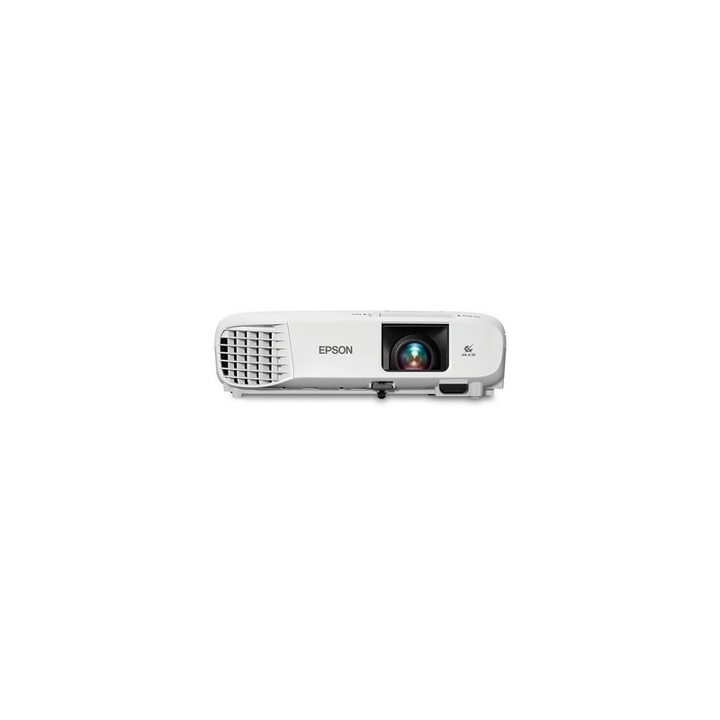 EspecificacionesContenido del embalajeGuía de configuración rápida DiseñoColor del productoBlanco Peso y dimensionesPeso2,7 kg Altura91,4 mm Ancho299,7 mm Profundidad248,9 mm Condiciones ambientalesIntervalo de temperatura operativa5 - 35 °C ProyectorBrillo de proyector3300 lúmenes ANSI Corrección trapezoidal, horizontal30 Razón de contraste (típica)15000:1 Relación de aspecto nativa4:3 Tecnología de proyección3LCD Número de colores1.073 billones de colores Resolución original del proyectorSVGA (800x600) Distancia de proyección del objetivo0,76 - 8,89 m Corrección vertical de keystone (trapezoide)30 VídeoFormatos gráficos soportados640 x 480 (VGA), 1024 x 768 (XGA), 1280 x 1024 (SXGA), 1280 x 800 (WXGA), 1280 x 960, 1366 х 768, 1400 x 1050 (SXGA+), 1440 x 900 (WXGA+) Alta Definición Total Señal analógicaNTSC,PAL LámparasDuración de lámpara6000 h Control de energíaConsumo energético326 W Potencia de bombilla210 W Sistema de lentesEnfoqueManual Relación de alcance1.45 - 1.96:1 Distancia focal fija1,67 cm Zoom óptico1,35x Consumo (modo de ahorro)237 W Fuente de energíaCorriente alterna Consumo de energía (inactivo)2 W Puertos e InterfacesCantidad de puertos VGA (D-Sub)3 Número de puertos HDMI1 Cantidad de puertos USB 2.01 Entrada de audio (L,R)1 Cantidad de lámparas10000 lámpara(s) Tipo de lámparaUHE ConexiónWifi Ethernet DesempeñoNivel de ruido (modo económico)28 dB Nivel de ruido37 dB Ranura para cable de seguridad Tarjeta de garantía Mando a distancia Pilas incluidas Cables incluidosCorriente alterna, VGA Manual de usuario Tipo de productoProyector para escritorio Tipo de ranura de bloqueo del cableKensington Conectar y usar (Plug and Play) Detalles técnicosRS-232C
